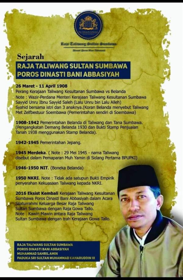 SUMBAWA, iNews.id - Raja Taliwang Kesultanan Sumbawa Dinasti Poros Abbasiyah Muhammad Syahril Amin menyurat ke pemerintah Kerajaan Belanda untuk meminta harta rampasan perang pada 1908. Surat tersebut ditujukan dalam hal ini kepada Dubes Belanda di Jakarta.